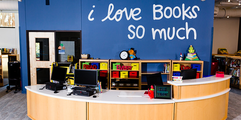 Resource Center service desk, library wall tops and caps, and hallway bulkhead.